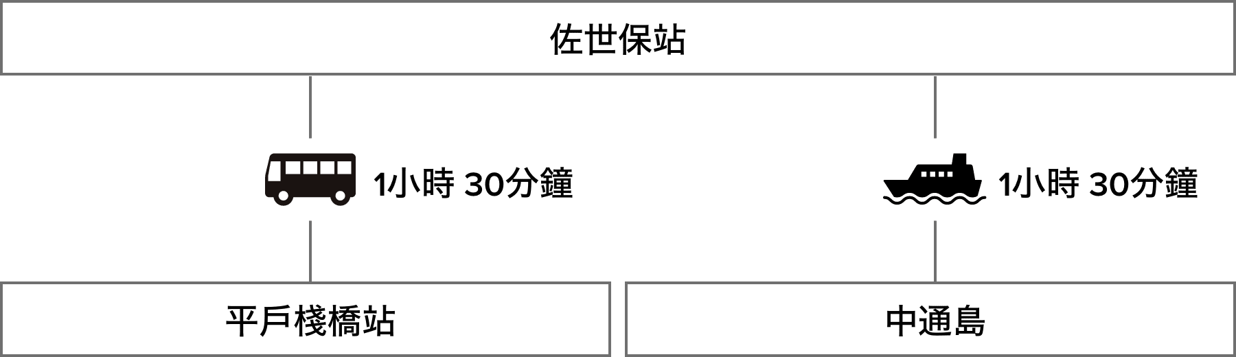 佐世保是長崎縣第二大城市,與西海國家公園有部分地區重疊。佐世保巴士中心位於佐世保火車站附近,是通往園內各景點的門戶。若要前往平戶島,可搭乘西肥巴士公司的直達車,從佐世保巴士中心搭到平戶棧橋站(約 1 小時 30 分鐘);若要前往九十九島,也可從佐世保站搭乘市營巴士,遊覽島上的各個觀景台和景點。雖然遊客能善用公共交通服務來造訪園內名勝,若想更有效率地暢遊景點,在佐世保站附近租車不失為一個好方法。若要從佐世保前往五島群島,可搭乘九商渡輪公司經營的高速船,從佐世保搭至中通島(約 1 小時 30 分鐘)。五島群島中,中通島是人口第二多的島嶼。