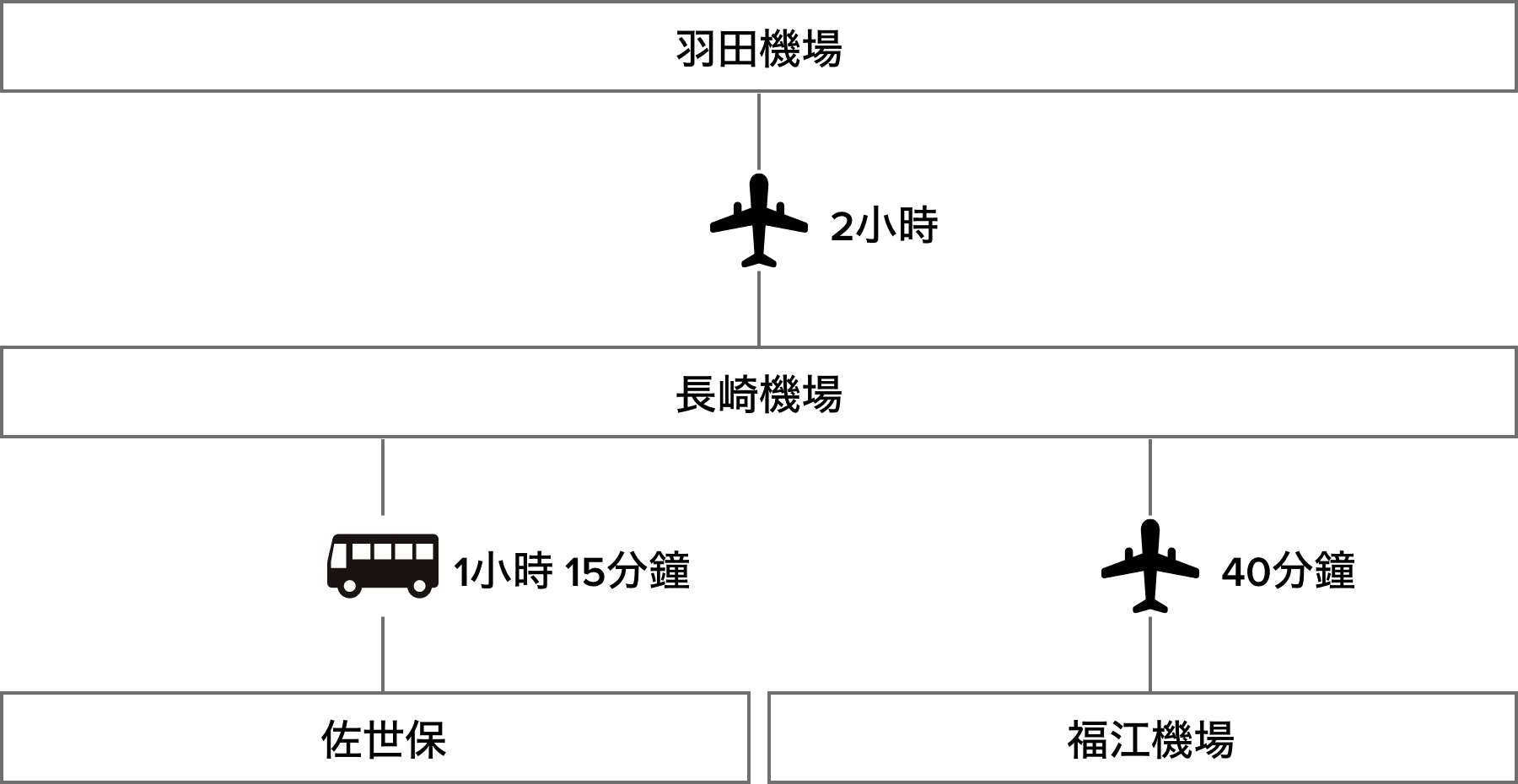 若從東京出發前往北松浦半島,可從羽田機場搭機至長崎機場(約 2 小時),再轉乘機場巴士至佐世保(約 1 小時 15 分鐘),接著按照下方「佐世保」部分的指示前往。若從東京出發前往五島群島,可從羽田機場搭機至長崎機場(約 2 小時),接著在長崎機場轉搭東方空橋航空公司的班機,飛往福江島的福江機場(約 40 分鐘)。五島群島中,福江島是人口最多的島嶼。