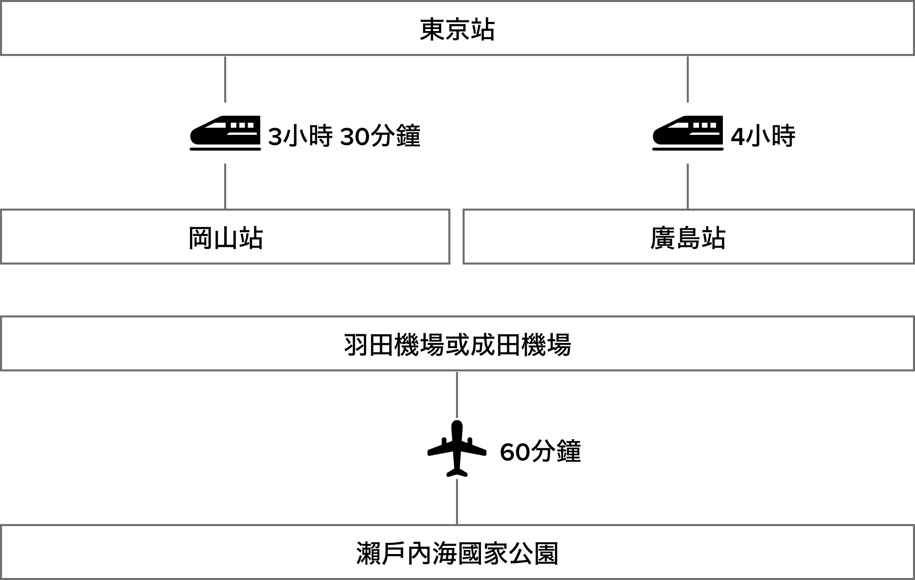 東海道-山陽新幹線橫貫日本主島本州地區,延伸至南部最大島九州。搭乘此路線行經大阪(從東京出發約需 2 小時 30 分鐘)後,您可在鄰近瀨戶內海國家公園的主要城市車站下車。若您的旅遊目的地為岡山西部或廣島(從東京出發分別需要 3 小時 30 分鐘左右和 4 小時左右),選擇搭乘飛機可能更為便利。您可在羽田機場或成田機場搭乘班機飛往公園附近的城市,包括高松、岡山、廣島、松山、山口縣宇部市、北九州市和大分等(約 60~90 分鐘)。
