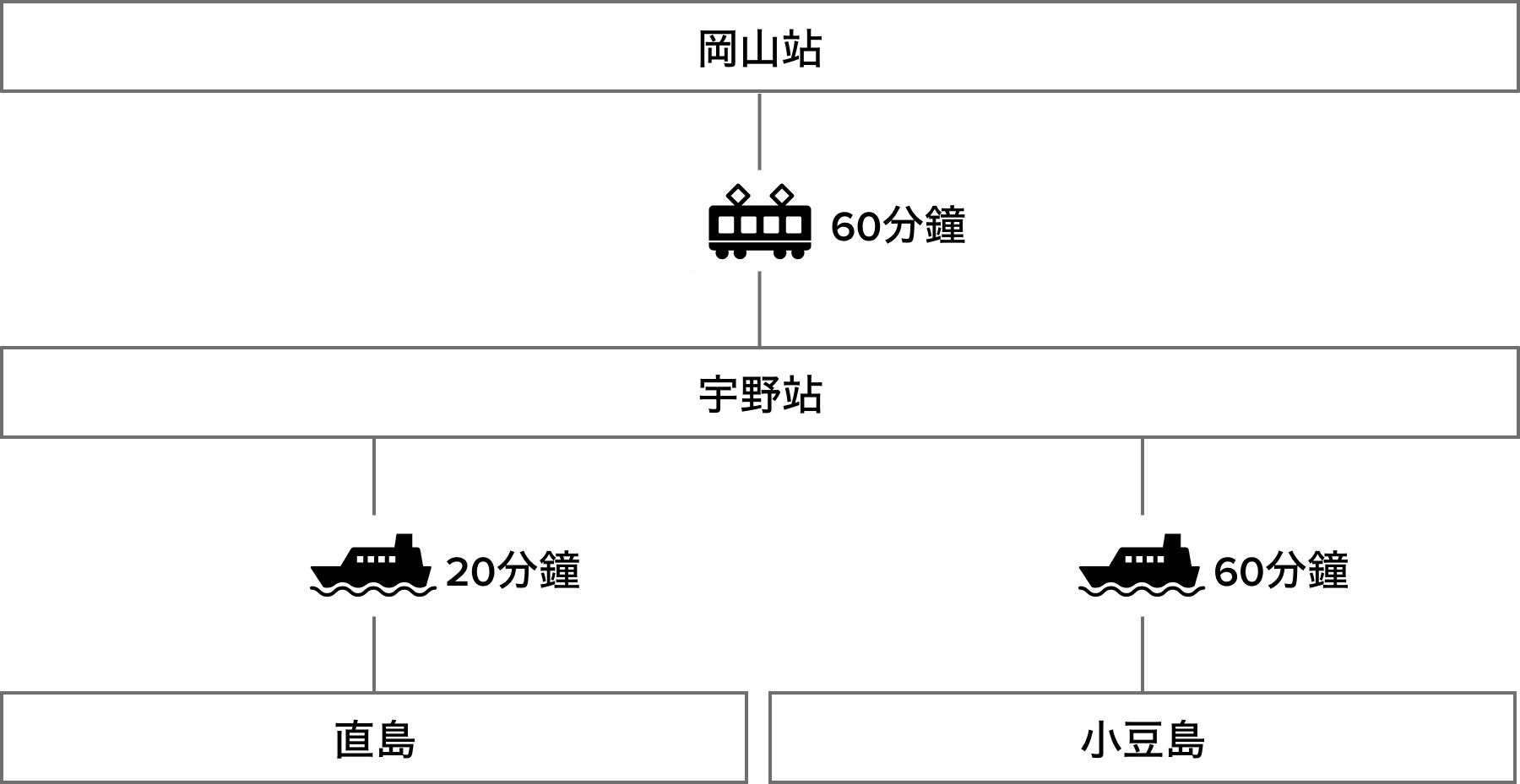您可以搭乘東海道-山陽新幹線至岡山站,此站將是您探索小豆島以及直島等「藝術島嶼」的理想起點。若要前往直島或小豆島,您可從東京出發,搭乘東海道新幹線至岡山站(約 3 小時 30 分鐘),接著轉乘宇野線至宇野站(約 60 分鐘),再步行前往宇野港(約 5 分鐘)。然後搭乘由四國汽船營運的渡輪前往直島(約 20 分鐘),或搭乘由小豆島豐島渡輪營運的渡輪前往小豆島(約 60~90 分鐘)。
